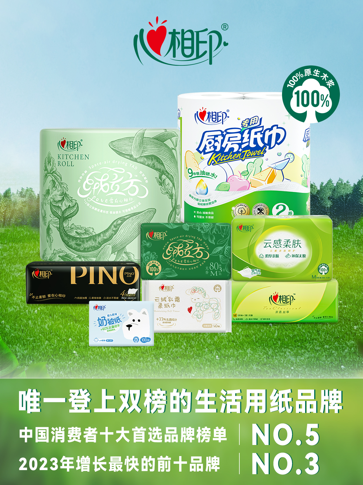 作為生活用紙行業(yè)國內(nèi)第一品牌,心相印以“不止柔韌,愛在心相印”為傳播口號對話消費者,始終秉持著“用心關(guān)愛身邊每一個人”的品牌理念,以溫馨、關(guān)愛為調(diào)性貼近消費者內(nèi)心訴求,給予消費者溫暖的守護和能量,位居“中國消費者十大首選品牌榜單”第五位。